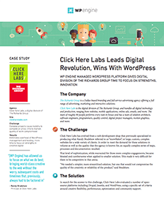 In this case study, discover how Click Here Labs overcame time constraints by switching to WordPress. You’ll also find out how they were able to debunk security concerns about WordPress to their clients, and the winning results they saw by enabling WP Engine’s performance platform. Read their story now!