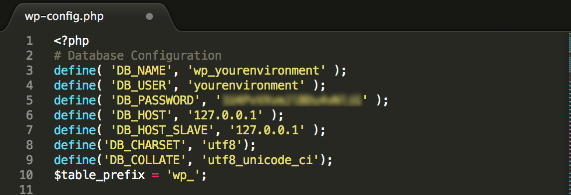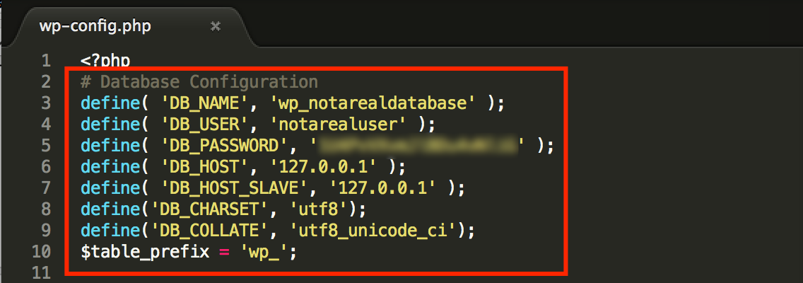 With the wp-config.php file open, pay special attention to the database settings near the top.