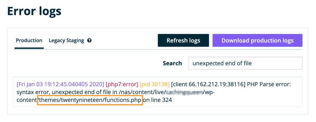 This error may present itself on the page when visited, or it may also appear as a blank “white screen of death,” or even as a 500 error. If so, determine if the error is caused by an “unexpected end of file” by looking at the Error Logs in the WP Engine User Portal.