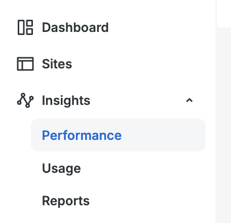 The Insights menu in the left sidebar lets you see account level pages for Performance, Usage, and Reports.