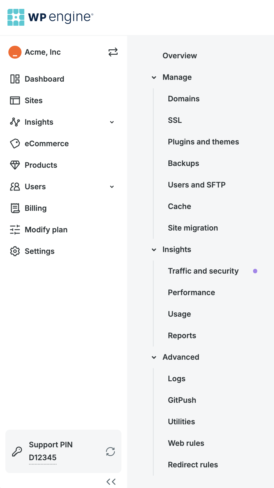 The WP Engine User Portal is your central hub for managing your WP Engine plan, features, and sites. You can find SFTP login details, access your database, create new sites and environments, view your account usage and billing, and much more from the User Portal.